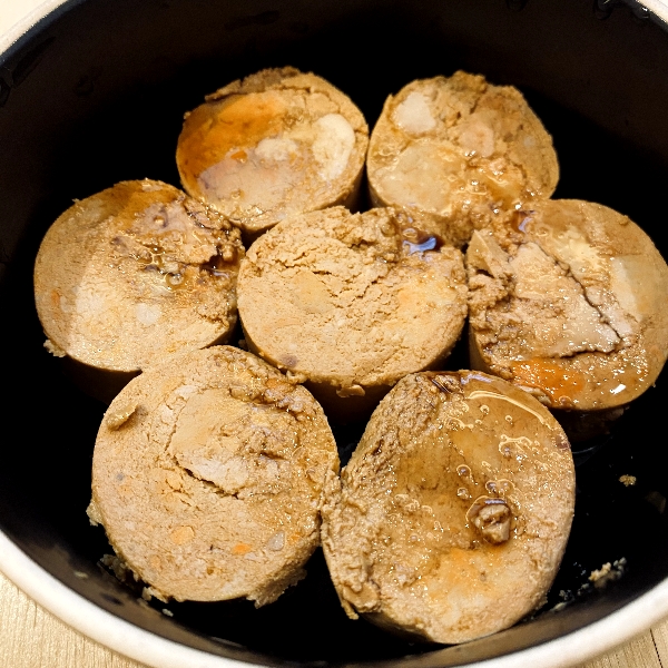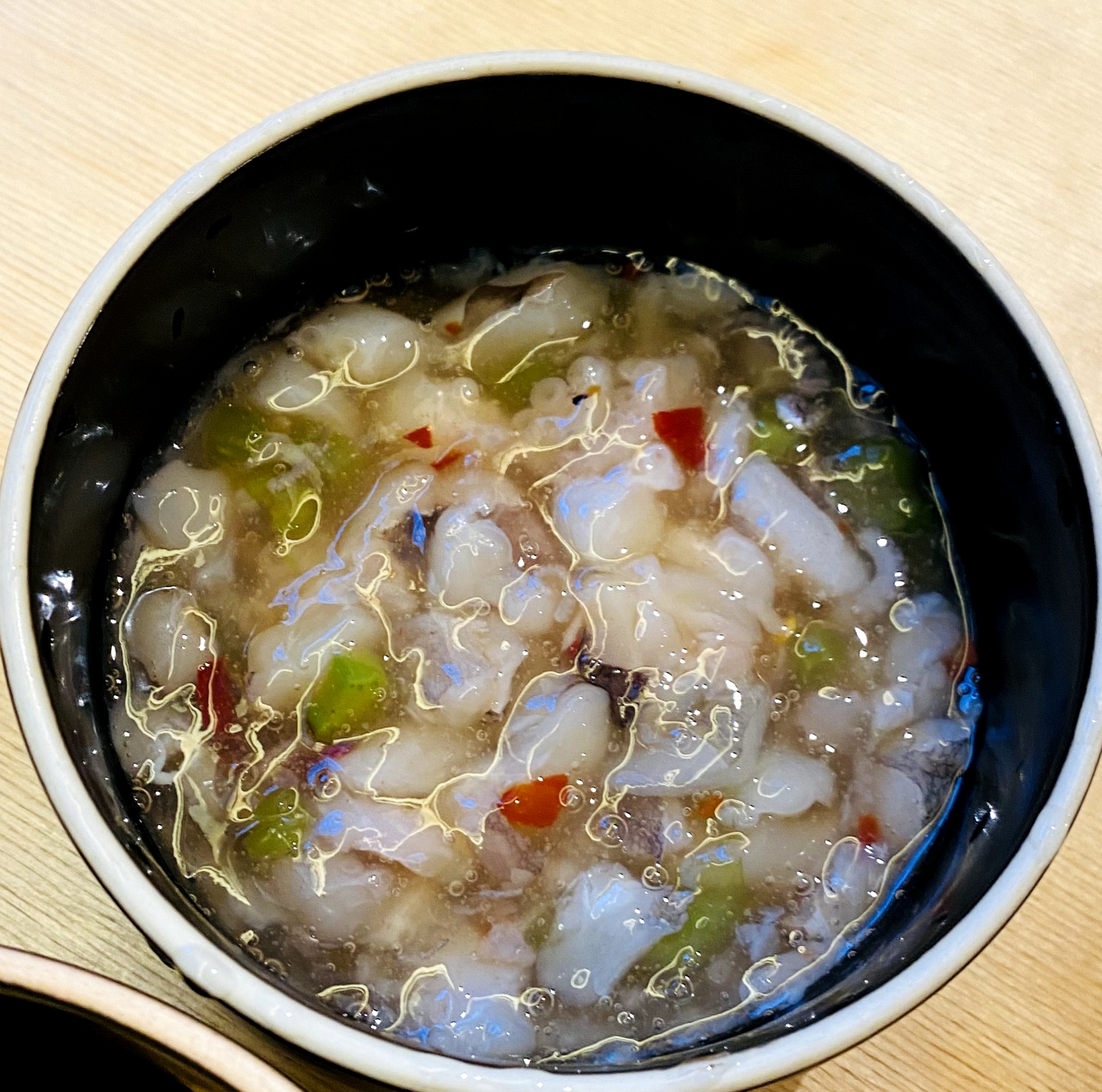 - 안키모를 먹기좋은 사이즈로 잘라서 그릇에 담는다 그후 참소스를 반정도 잠기게 넣어 참소스의 맛이 스며들게한다.
