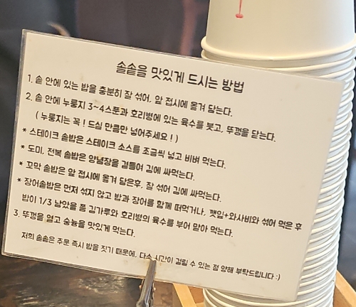 위에 친절하게 먹는 방법을 작성해 두셔서 저도 열심히 비비고 제공된 그릇에 덜고 누룽지로 바로 갔습니다.