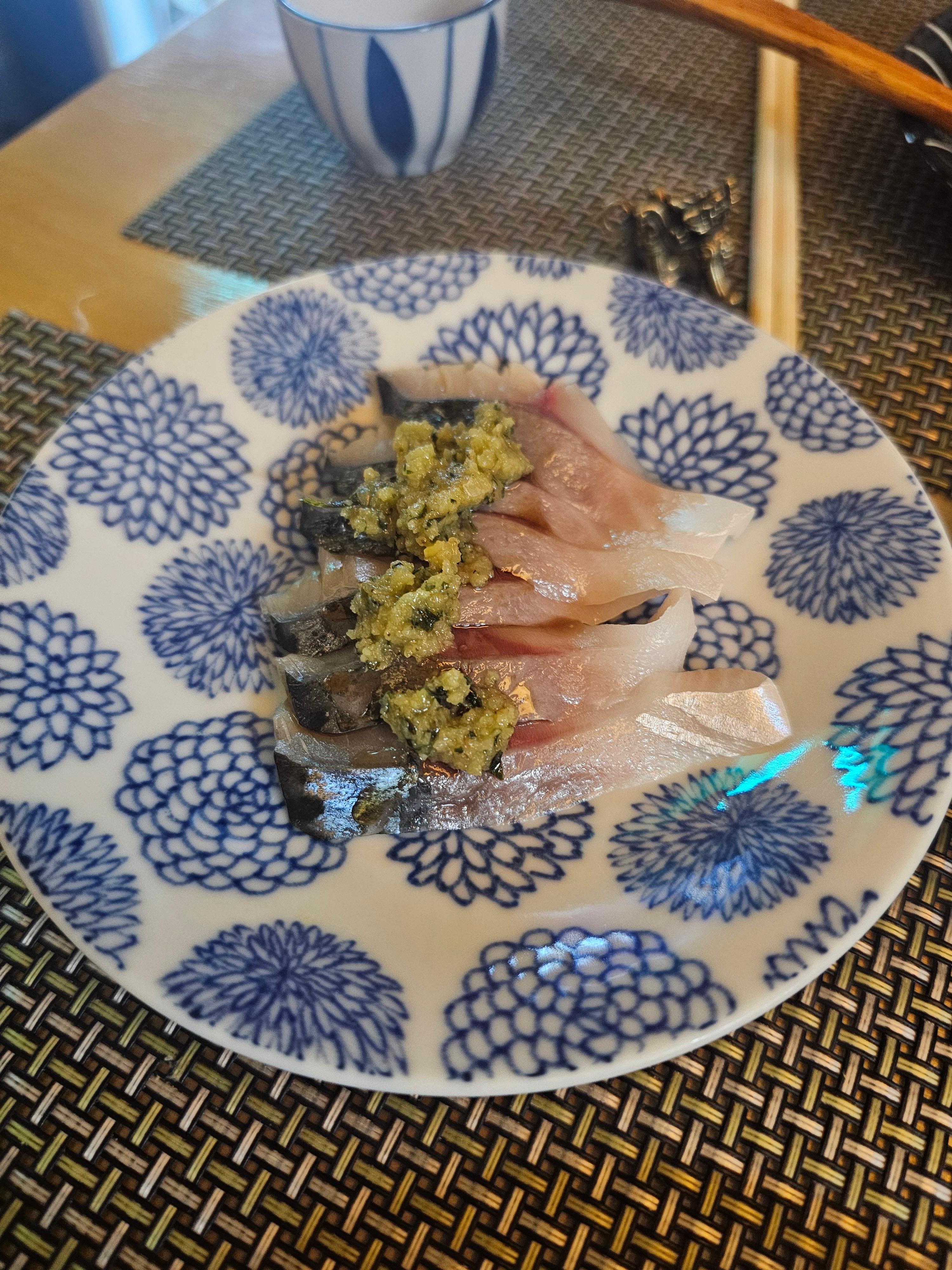 두번째 서빙해주신 사시미는 훈연을한 참돔과 바질소스를 얹은 시메사바를 준비해 주셨습니다.