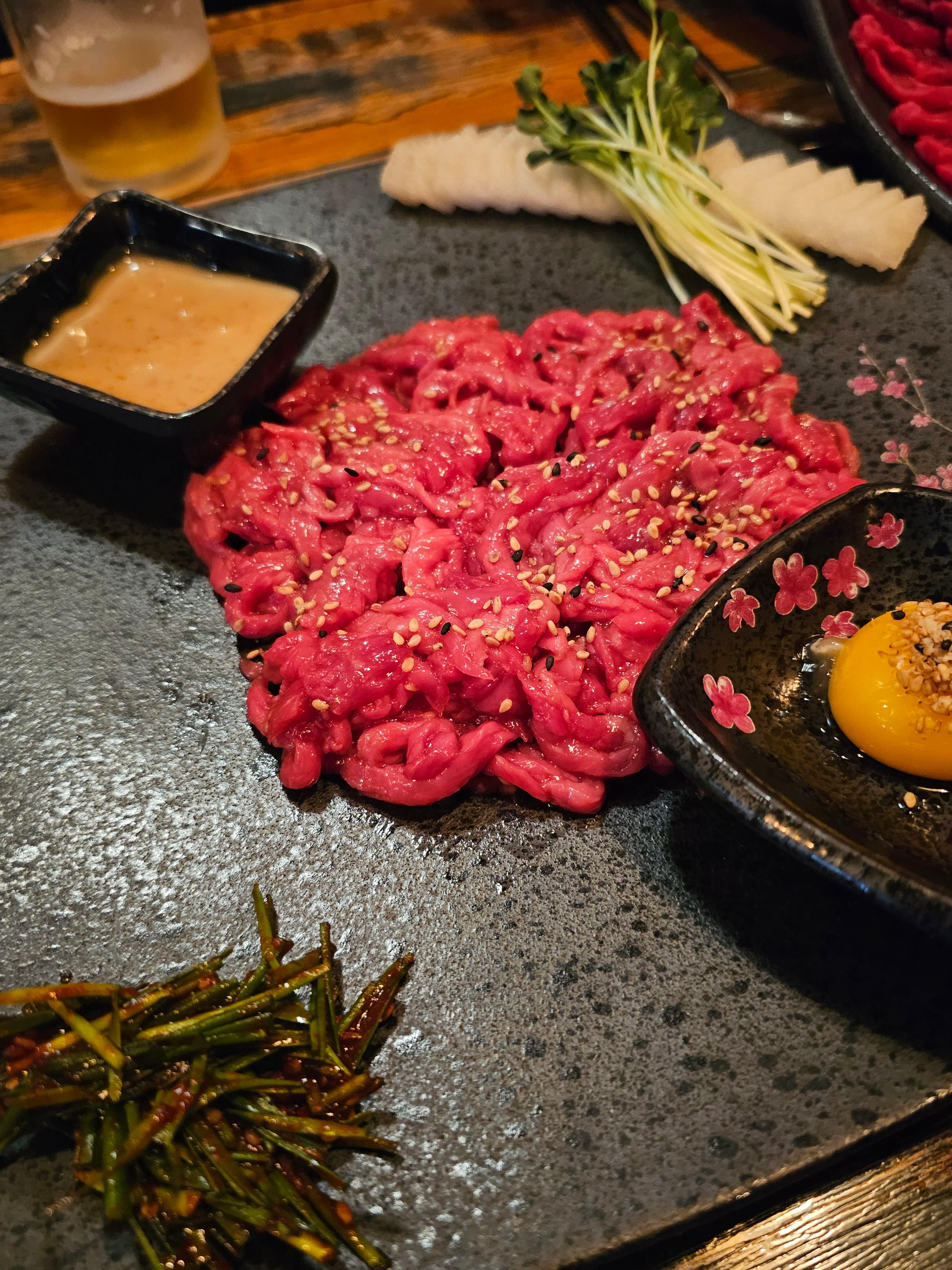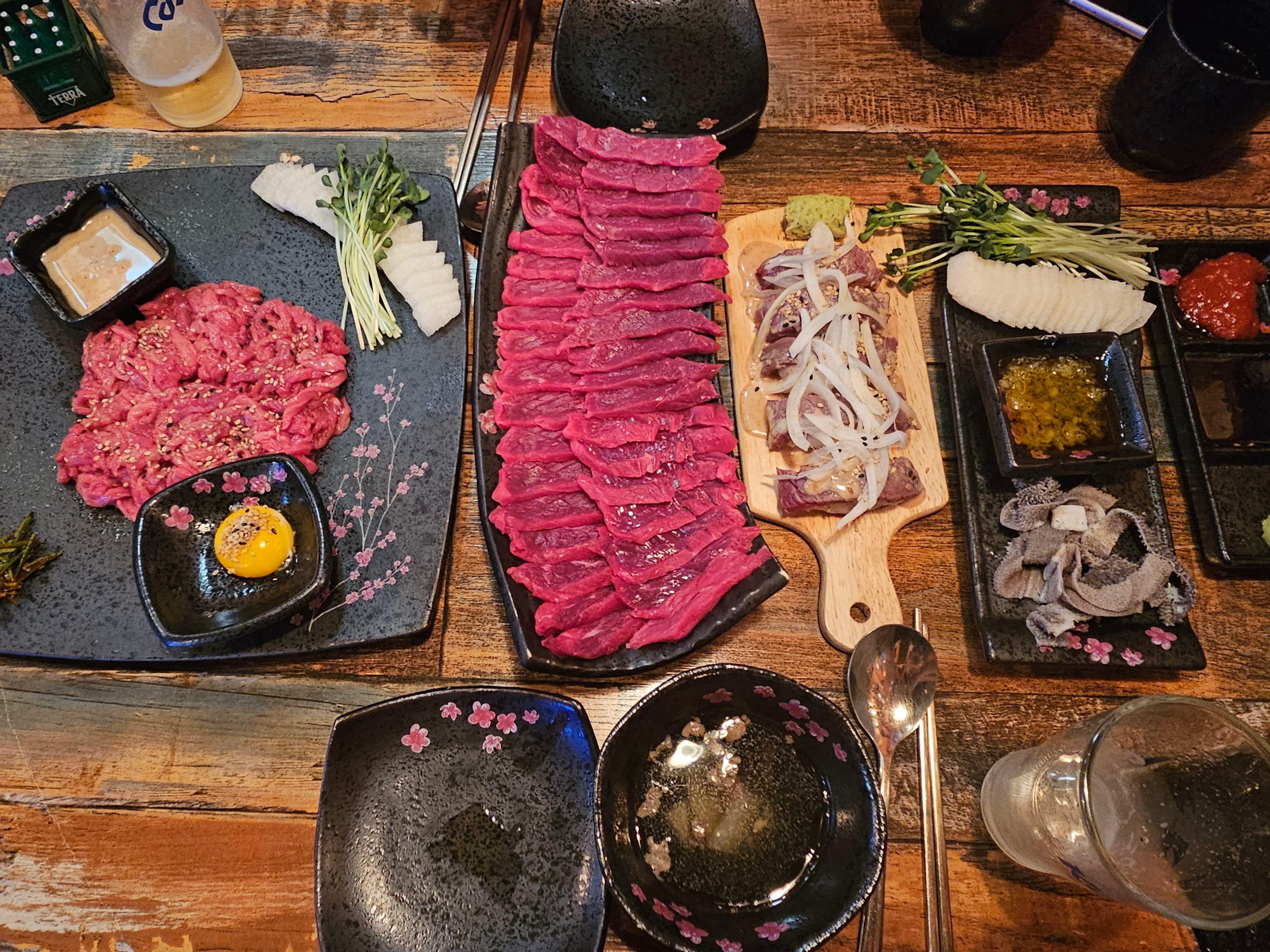 1 Out Set 는 육사시미 + 육회 小 + 소고기라면 or 육회초밥 5피스가 제공되는 세트메뉴로 두명이 먹기에 충분한 양입니다!!