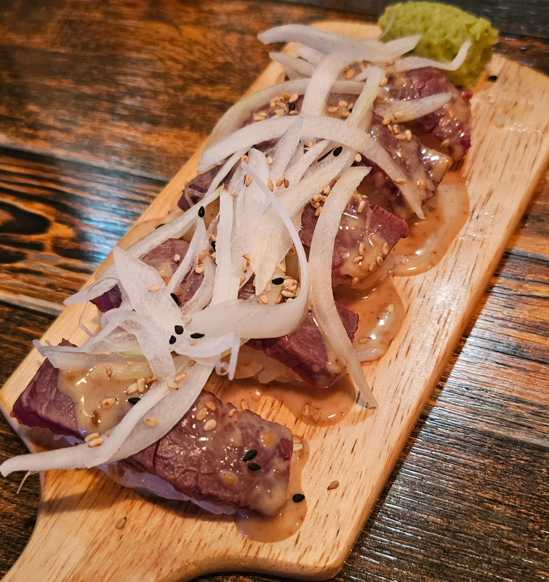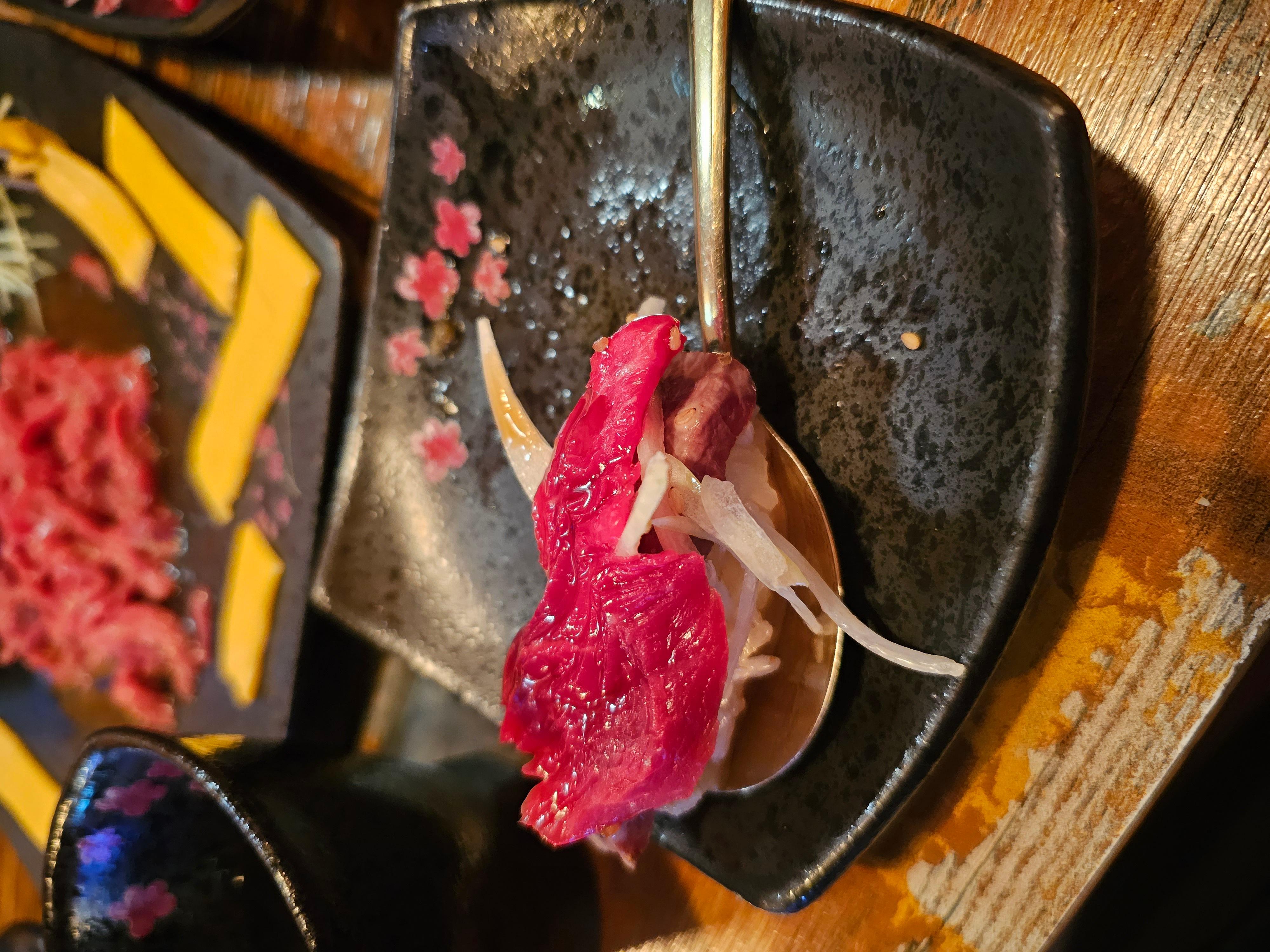 제가 육회초밥 먹는 방법은!! 기본 육회초밥에 올려져있는 양파 그리고 와사비를 우선 올려줍니다. 그리고 그 위에 간장을 살짝 찍은 육사시미를 그 위에 얹어서 같이 먹는 방법입니다!