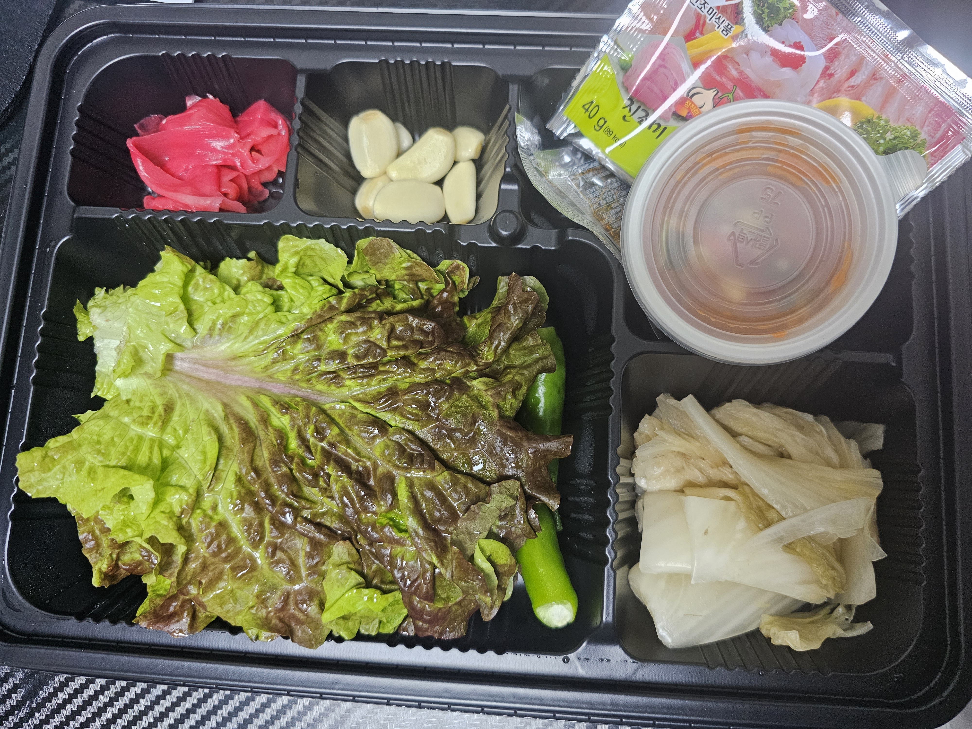 - 반찬: 깻잎,상추, 마늘, 백김치, 초고추장 간장 등