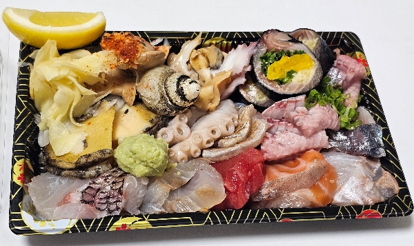 *사시미 구성: 참돔, 광어, 참치, 연어, 주꾸미다리, 문어숙회, 전복찜, 안키모, 청어, 소라, 미니마끼