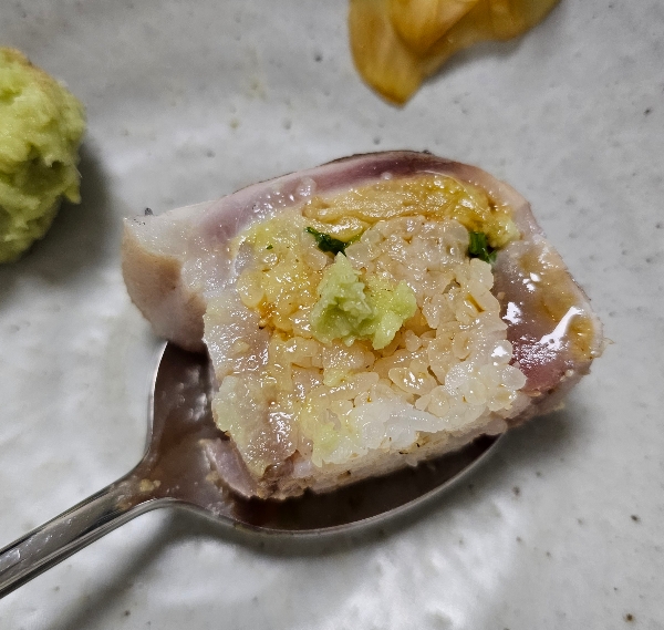 오늘의 픽 중 하나는 안키모였습니다. 직접 손질된 아귀 간 받아 후공정 하시는 거 같았습니다. 식감은 부드러운 식감을 잘 살려주었고, 신선한 원물이었는지 잡내 없이 좋았습니다. 특징은 완전히 크리미 하지 않고 시중 소시지형과 오마카세 안키모의 중간의 크리미 함이었는데 오히려 오늘은 부드럽기와 크리미함이 조화로웠습니다. 아무래도 저는 조금 더 크리미 했으면 해요..