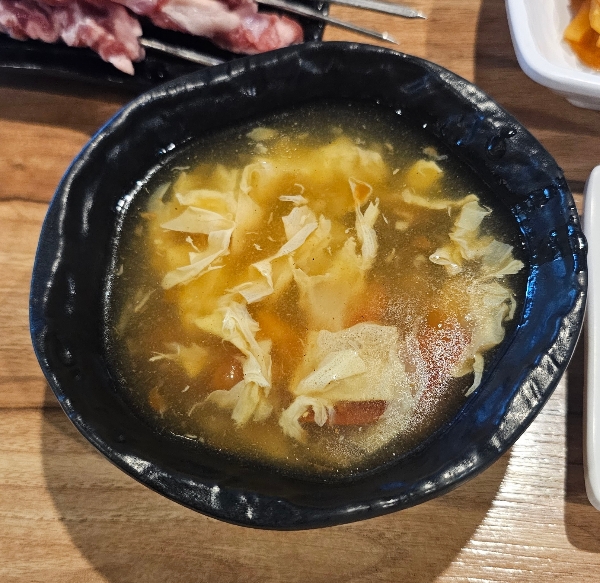 주문하면 12,000원 짜리 메뉴인데 기본으로 제공되니 얼마나 좋은지 모릅니다!! 따뜻하게 제공되고, 살짝 걸쭉해서 고기가 익는 동안 속을 코팅해주는 역활을 해줍니다. 제공되는 양은 서비스이지만 개인당 국그릇 하나씩 가득 채울만큼씩 주십니다. 가성비 미쳤습니다!