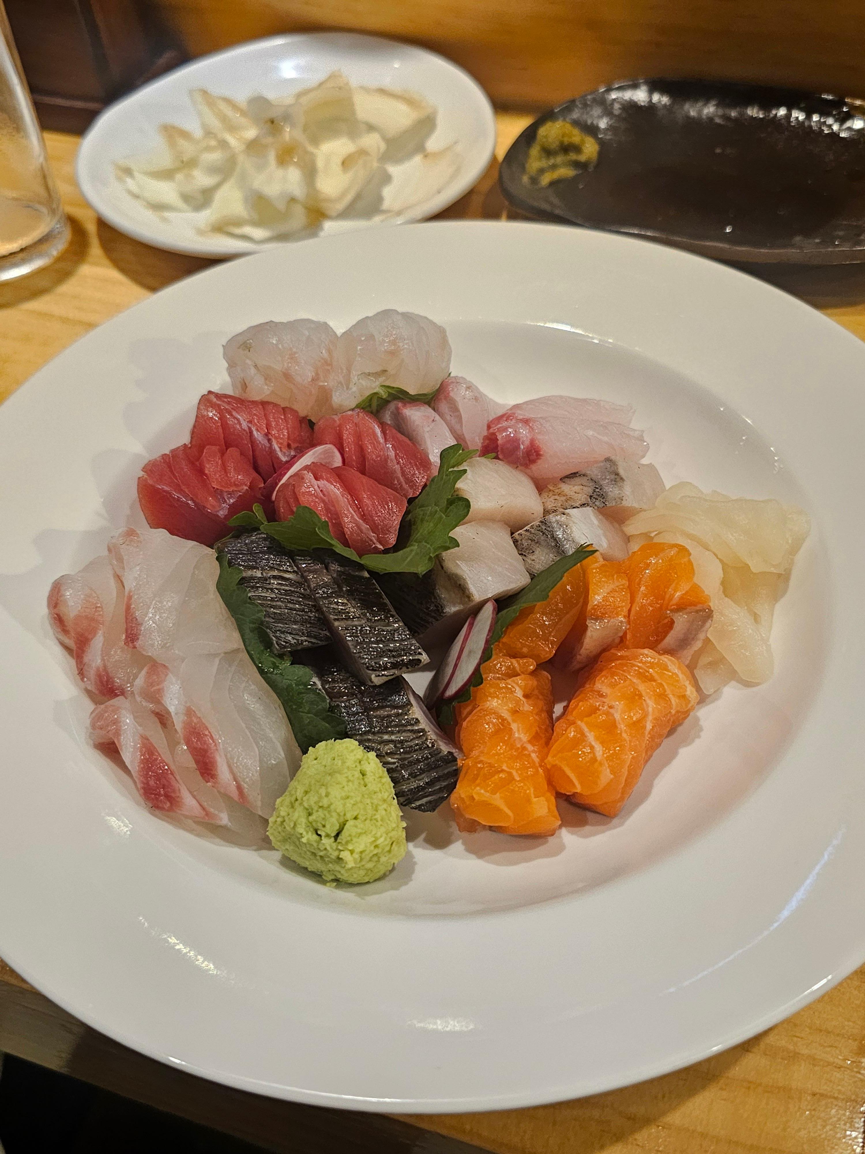 📌 사시미 구성: 참돔, 구운 삼치, 훈연 시메사바, 연어, 참치, 광어, 잿방어 뱃살, 잿방어 등살