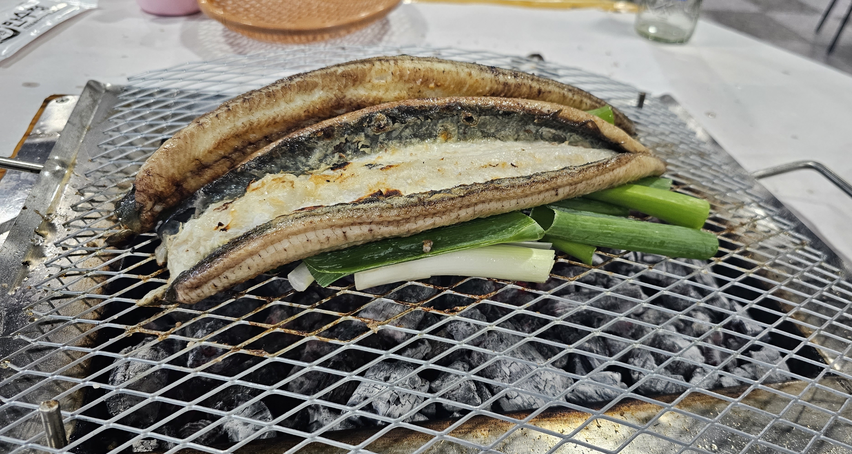 일차적으로 구워지면 파를 구워주시는데 장어를 얹어서 파향을 장어에 입히면서 장어에서 떨어지는 기름이 파를 맛나게 익혀준답니다!!