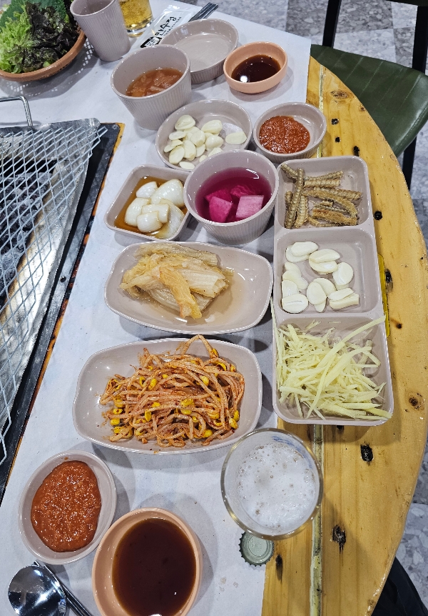 반찬은 기본 찬 구성지죠! 상추 깻잎, 콩나물무침, 백김치, 마늘, 양파짱아찌, 생강, 소스류, 김치국, 장어 뼈튀김까지 부족함이 차려주십니다. 더 가져다 드시는거는 반찬코너에서 셀프로 챙기시면됩니다~!