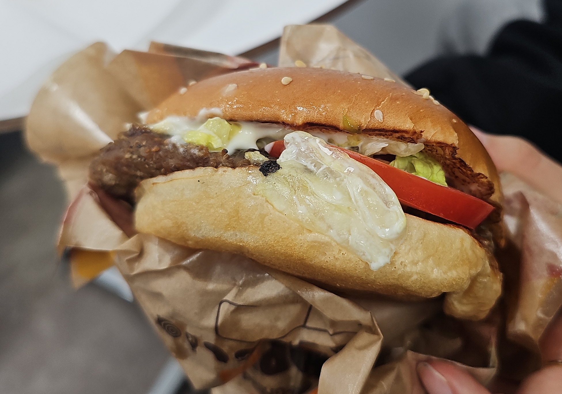소고기 패티가 기본베이스이고, 토마토와 양상추가 채소로 들어가있어요.