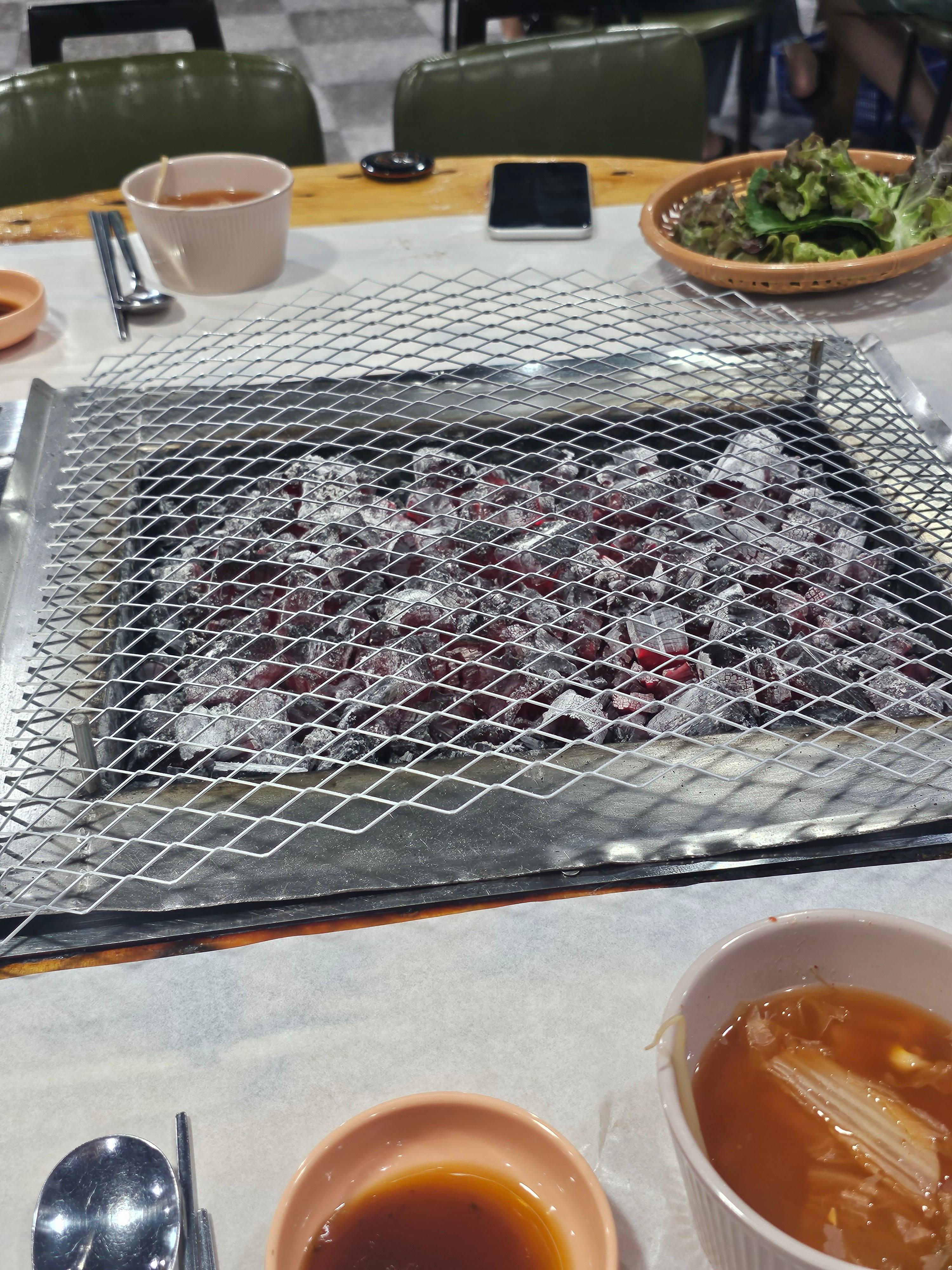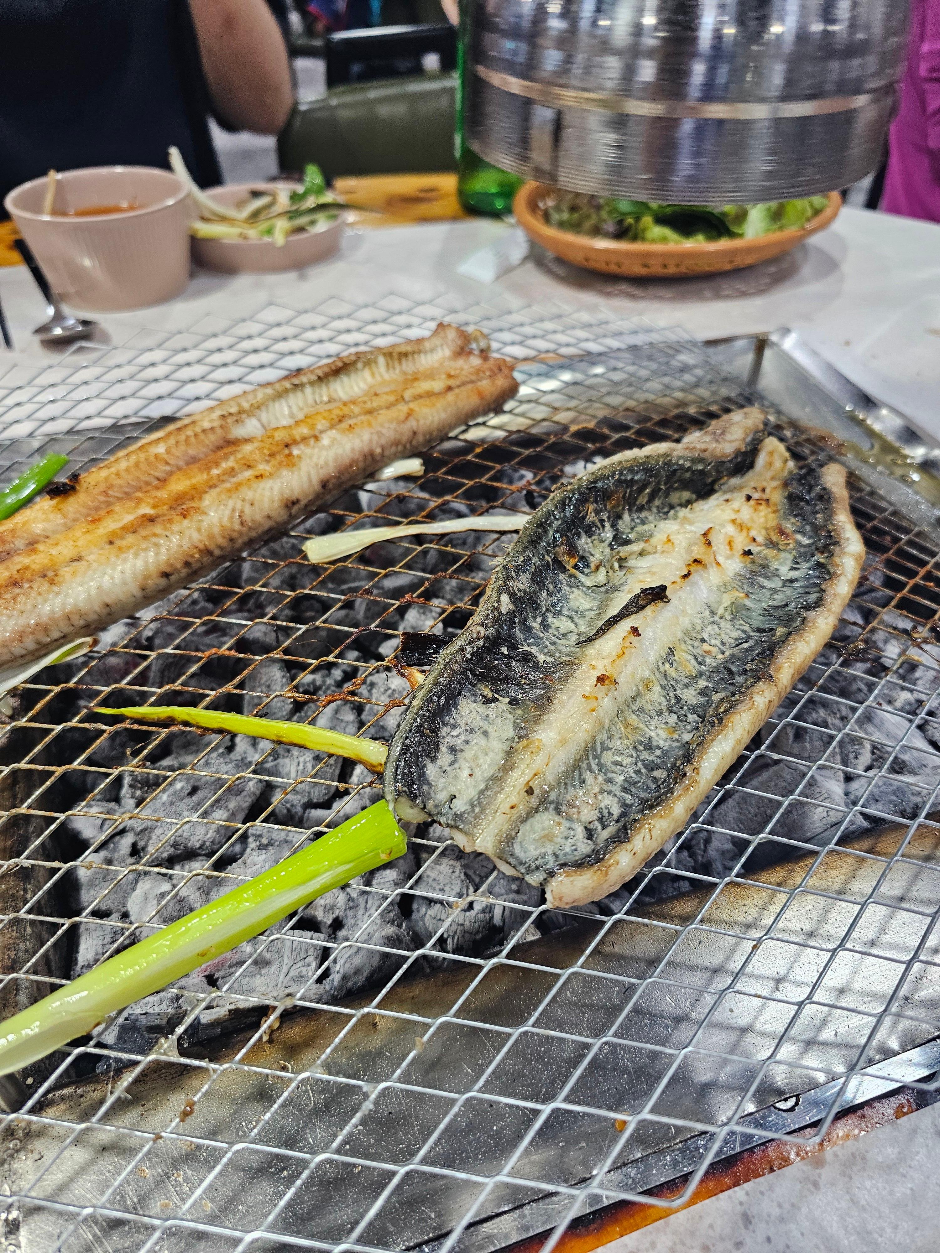 기본찬이 깔리자마자 불이 들어오고, 불이 들어온 순간 직원분께서 장어 두마리를 얹어주십니다!