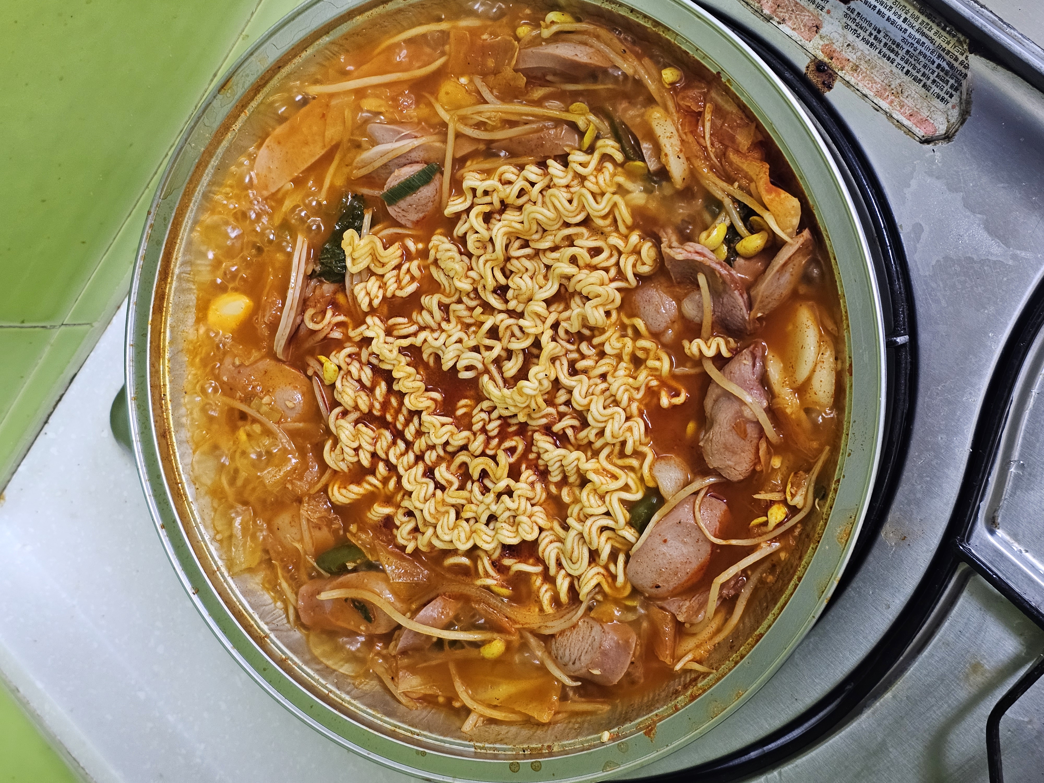 *내용물: 콩나물, 떡사리, 파, 햄, 콩 빈, 고추, 라면사리, 치즈
