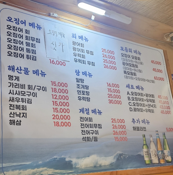 메뉴는 위와 같고 오징어의 경우는 가격이 변동이어서 그때그때마다 물어봐야 해요!