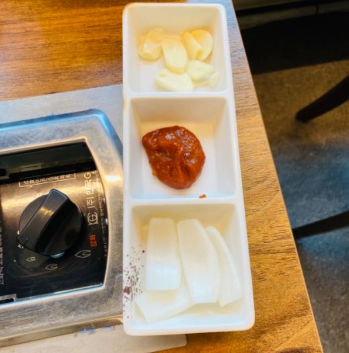 기본 반찬은 정말 간단하게 나옵니다! 시원한 물김치국물과 기본쌈채소, 열무김치 그리고 마늘 쌈장 이렇게 제공이 됩니다..... 정말 단촐하더라고요.....